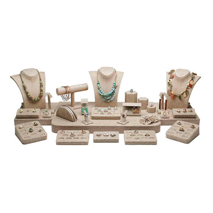 単一のケースやウィンドウでフルラインのディスプレイを完成させるか、2つ以上のケースで統一感のある外観を作り出すことができる、この魅力的な現代的な麻布製29ピースディスプレイセット。未染色の麻布は美しい自然な色合いと魅力的で目に見える質感を持ち、ほぼすべてのジュエリースタイルに調和します。このセットには3つのライザーが含まれており、さまざまなディスプレイスペースに対応可能です。3つを組み合わせて大きなディスプレイを作成するか、個別のディスプレイのアンカーとしてそれぞれ使用できます。自然色の麻布生地が木製および段ボール製のフォームを覆っています。"}