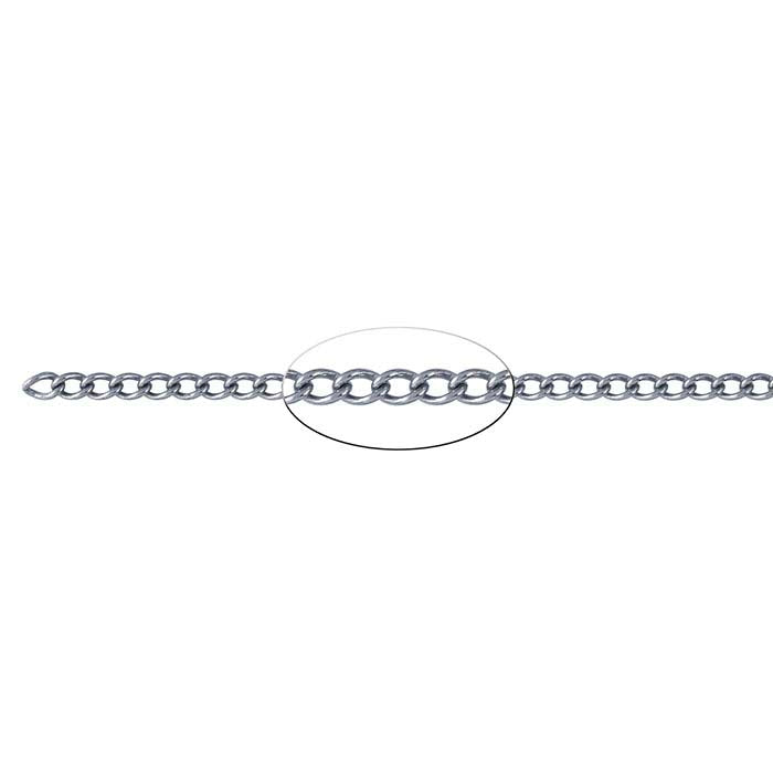 A curb chain starts as a cable design, then has its links twisted so they lie flat; the twist gives the links a slightly interlocked look that adds dimension to the chain profile.