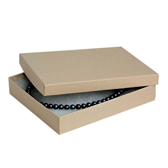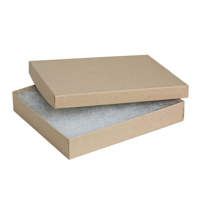 この紙で覆われた2部構成のユニバーサルボックスは、さまざまなジュエリースタイルに対応しています。ボックスはそのまま使用することも、無地のカラーボードボックスと組み合わせてブランドに合わせたカラーバリエーションを作成したり、季節のパッケージや特別な機会に合わせたりすることも可能です。装飾用リボン、ギフトラッピング、またはボウ(別売)を追加して、各ボックスをカスタマイズできます。小麦色のリサイクル紙(100%ポストコンシューマーファイバー)が、90%ポストコンシューマーファイバーと10%プリコンシューマーファイバーで作られた100%リサイクル段ボール箱を覆っています。箱には変色を引き起こさない厚さ1/2インチの白いポリフィル綿が含まれています。ギフトボックスに会社名やロゴをホットスタンプして、ジュエリー販売後も長く記憶に残るようにしましょう。