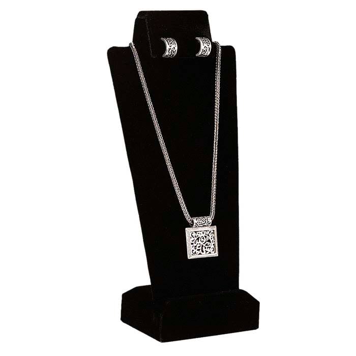이 슬림한 디스플레이는 블랙 벨벳으로 제작되어 최대 20인치 길이의 목걸이 한 개와 매칭되는 귀걸이 한 쌍을 전시하기에 완벽합니다. 디스플레이 앞면에 제공된 구멍에 포스트형 또는 와이어형 귀걸이 한 쌍을 꽂고, 목걸이 체인을 디스플레이의 "어깨" 부분에 걸어 뒷면에서 남은 체인을 고정하세요. 디스플레이의 전면은 약간 좁아지는 형태로 세련된 느낌을 주며, 최적의 시야를 위해 약간 기울어져 있습니다. 부드러운 블랙 벨벳은 섬세한 체인부터 밝은 보석까지 모든 주얼리 스타일과 색상에 훌륭한 조화를 이룹니다. 스탠드는 하나 이상의 체인이나 목걸이를 세워 전시하는 데 이상적이며, 추가 높이는 선택된 제품에 시선을 집중시키고 더 복잡한 디스플레이 구성에 질감을 더합니다. 블랙 벨벳 원단은 패딩 처리된 나무와 판지 형태를 덮고 있으며, 베이스는 경사져 있습니다.