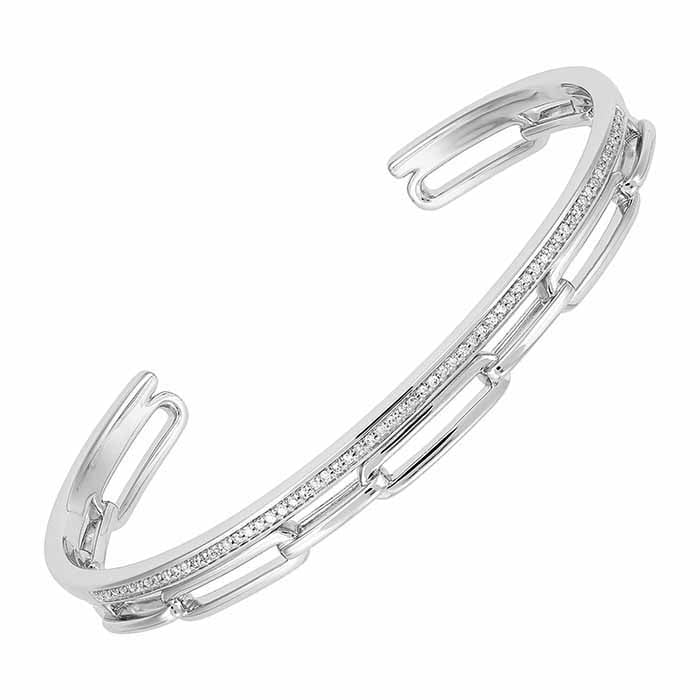 이 스털링 실버 커프 팔찌는 이중 레이어 디자인으로 구성되어 있습니다; 하나는 긴 체인 링크이고, 다른 하나는 여러 개의 둥근 흰 다이아몬드(I3 투명도/H–I 색상; 1/4CTTW) 행입니다. 단독으로 착용해도 좋고, 여러 개를 겹쳐 착용해도 멋집니다. 팔찌에는 보증된 제품 품질의 상징으로 ".925" 스털링 실버 스탬프가 포함되어 있습니다.