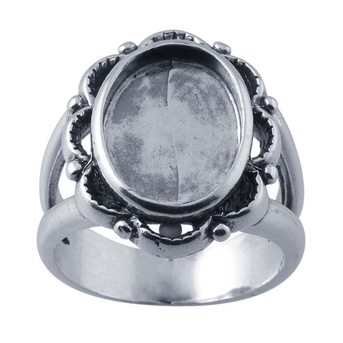 This sterling silver ring mounting features a split-shank design and a bold, open scallop design around a bezel mounting that holds one 14 x 10mm oval cabochon or flat-back stone or crystal. A single bead detail between each scallop and ridge details on the top edge of the scallops enhance the intricate design of the ring. Use jeweler's epoxy to secure the cabochon in the mounting.