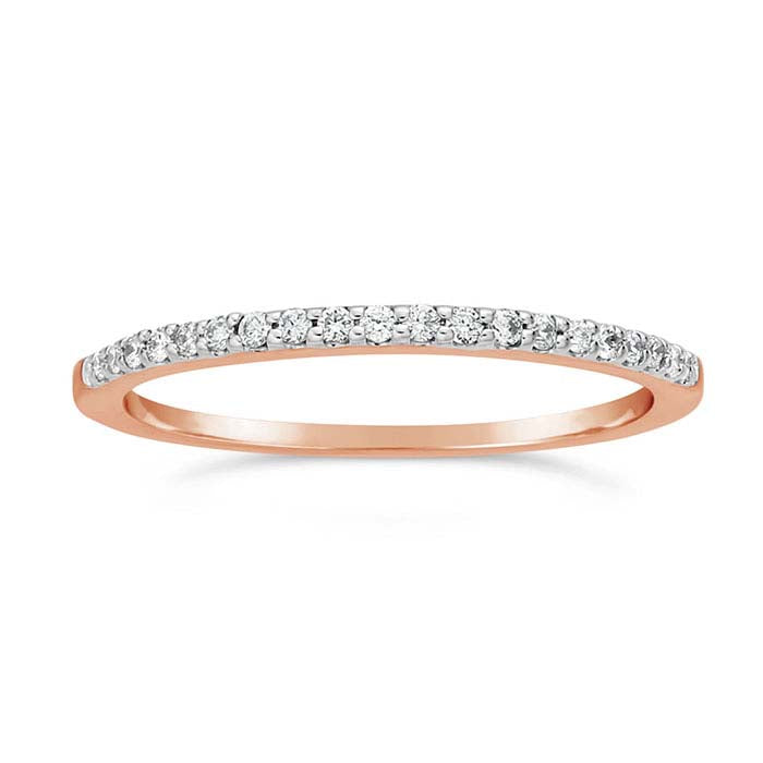 Šis 14 karatų rožinio aukso vestuvinis žiedas šiek tiek siaurėja nuo centro ir yra puoštas 20 apvalių deimantų, įtvirtintų bendruose 4-kablių baltojo aukso laikikliuose: aštuoni 0,008 ct. ir 12 0,600 ct. (SI1 skaidrumas/G, H spalva; 0,136CTTW). Tai puikus priedas beveik bet kokio sužadėtuvių žiedo stiliaus ir idealus pasirinkimas jubiliejiniam žiedui.