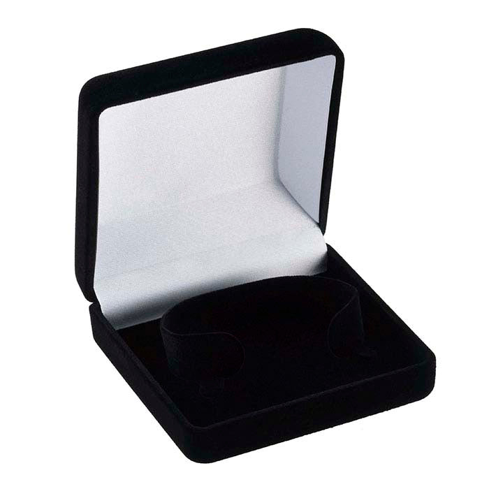Covered with black velour, this hinged necklace box is ideal for packaging or displaying one watch or bracelet. Add a decorative ribbon, gift wrapping or bow (available separately) to customize the box. Black velour covers the plastic box with a white satin lining that covers the hinge; matching-color velour covers the contoured, cardboard insert. Delivered in a one-piece packer.