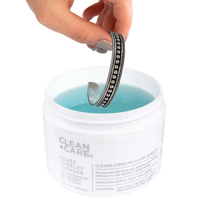 Specifically made for sterling silver, this jewelry cleaner from Clean + Care® uses an organic, acid-based formula that effectively removes dirt, oil, grime and tarnish from silver without scrubbing or polishing. It is lightly scented with lavender and is made with an advanced formula that leaves your jewelry sparkling like new with no rinsing or agitation. The solution comes in a frosted jar and includes a basket and brush.As one of the fastest growing jewelry care lines on the market, woman-owned Clean + Care® products keep jewelry sparkling like new. Each cleanser is made with a trade-secret formula that is tough on grime and gentle enough on jewelry for daily use.