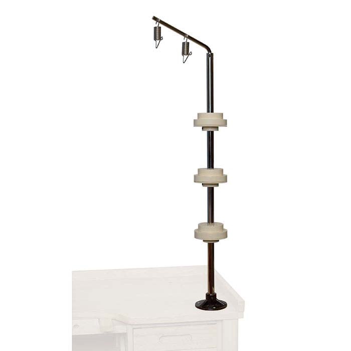 This telescoping flex shaft motor stand accommodates two motors; adjust height from 32" up to a maximum of 52" high. The motors, hanging securely from spring-loaded hooks, are conveniently at hand when needed and swing out of the way when not in use. Three round plastic bur/tool organizers (4" diameter x 1-3/4"H) can be positioned anywhere along the stand, held in place by a thumbscrew underneath. Each stepped organizer holds up to 75 separate 3/32"-shank burs, drills or other rotary tools and rotates easily on its base to provide easy access to the tools. Screw the base (3-3/4" diameter) to your bench or work surface (hardware is included) to secure it in place.