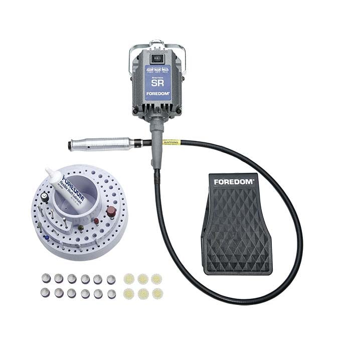 The Foredom K.5240 kit includes everything you need to get working right out of the box—no worries or struggling with selecting the right tools for the job. This kit is ideal for carving tasks, creating models, shaping components and more. Includes a motor with flex shaft and handpiece, a controller and an accessory kit; the motor and flex shaft are covered by a manufacturer's 2-year limited warranty.Kit components include:• One H.44T handpiece, a collet-style handpiece that offers the least runout of any flex shaft handpiece, making it ideal for precise work. This handpiece adapts to larger accessories with shanks up to 1/4"; includes 3/32", 1/8" and 1/4" collets.• One Series SR motor, the best choice for general use. The 1/6 HP, ball-bearing, hang-up style motor runs in forward and reverse at speeds up to 18,000rpm and offers substantially more power than most of our universal motors (6% more than Series CC and 33% more than Series S and old SR). Features a 39" long key-tip inner shaft and outer sheath (and can be connected to any Foredom interchangeable handpiece).• One C.FCT speed control, an extra-wide, foot-operated control with solid state electronics and heavy-duty plastic housing.• One AKWK53 accessory kit, 27-piece assortment with 3/32", 1/8" and 1/4" shank accessories.• One tube flexible shaft grease.