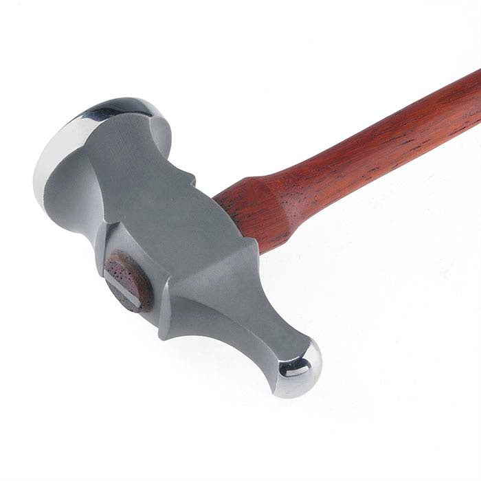 This Fretz® heavy chasing hammer, with one large round face and one smaller half-ball face, is ideally suited to your most substantial work. Inspired by the high-relief work of the great Italian Renaissance artists, it is designed in classic European style, with a slightly tilted face, heavy head and slim neck. When used properly, the weight of the head, rather than the muscles in your arm and hand, drives the downward motion of this tool. The large round face is intended for striking chasing tools or punches, and the smaller half-ball face is intended for peening and riveting.