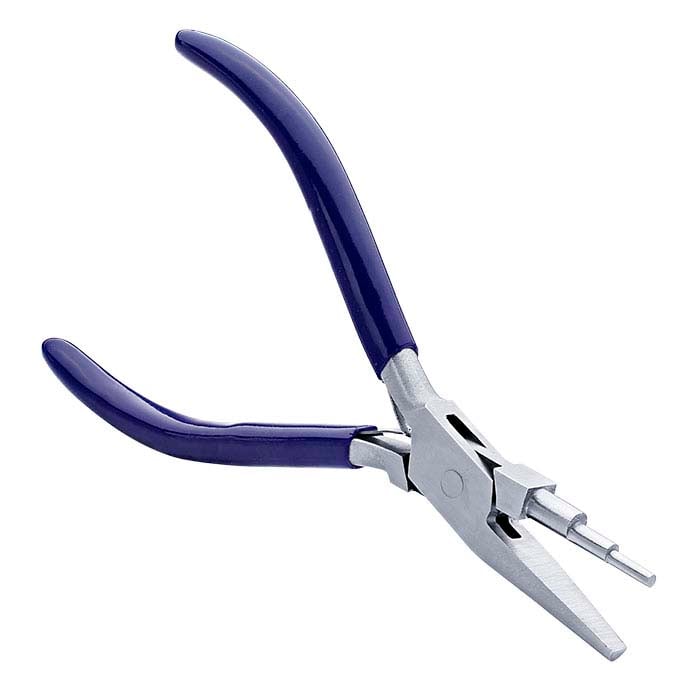Specifically designed to meet the needs of wire-wrappers, the three-step jaw of these wire-wrapping pliers gives you the ability to create the widest variety of loop sizes without changing tools. The stepped barrels, approx. 2.4, 4.1 and 5.2mm diameter, are approx. 9.2mm long. One of the jaws is chain nose, providing a flat interior surface facing the stepped barrels.• These pliers have a lap joint; one half of the joint overlaps the other, and a pivot is set through both halves.• The double-leaf spring consists of flat, tempered metal tabs attached to the inside of each of the handles, positioned to meet and hold the handles apart (and the jaws open) until they are squeezed closed.• The handles are dipped in plastic to ensure a firm and comfortable grip.