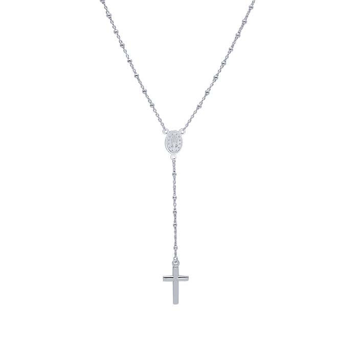 Featuring a y-style design, this sterling silver rosary has a classic cross with straight arms and beads along the entire length. This chain is plated with fine silver to ensure a bright white color and to help protect against tarnish.