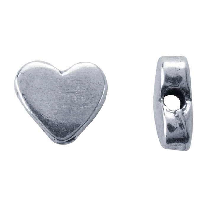 This sterling silver bead features a heart design and a vertical-drilled hole, allowing you to stack the bead in dangle or drop designs. Use it in multiples for an especially effective look or use an individual bead for variation with other strung elements in bracelet, necklace or earring designs. The bright finish of the bead makes a striking contrast when partnered with gemstone beads, small round bright and matte-finished beads or with tube beads.