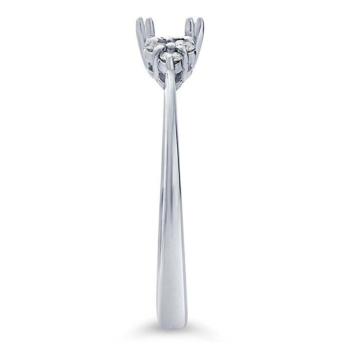This 14-karat white gold ring mounting features a double-prong basket mounting that holds one 4.4mm (0.33-ct., approx.) round faceted gemstone. A variation on a classic 4-prong setting, which supports the gemstone on four sides, the double prongs create eight contact points for added security for your center stone. The basket setting features open sides designed to allow more light to reach and move through the stone, enhancing its brightness and brilliance. The shank is set with 6 0.02-ct. round diamonds (SI clarity/G, H color; 0.12CTTW), three on each side of the center mounting, creating a triangle shape that transitions into the shank. The shank on this ring tapers from 2mm to 1mm. Cut a seat in the prongs to accommodate your stone, then burnish the prongs over the stone to secure it in place.