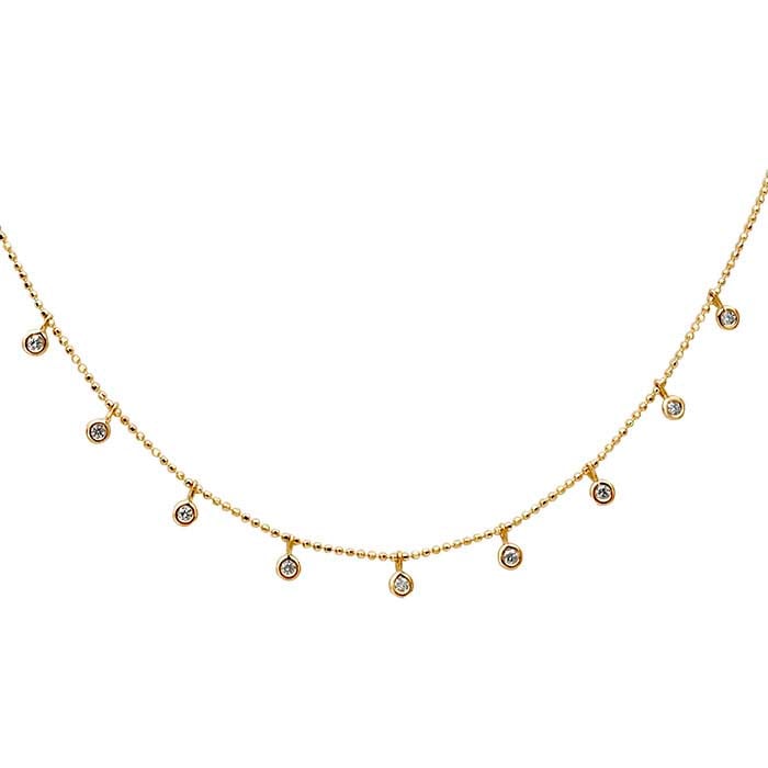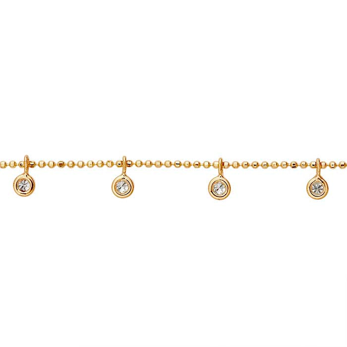 Laget av 1 mm diamantkuttet perlekjede, har dette 14 karat gule gullhalskjedet ni bezel-satte 0,027 ct. (1,9 mm) runde hvite diamanter (I-I2 klarhet/H-I farge; 0,25CTTW). En 2" teksturert kabelkjede-forlenger lar kundene justere halskjedets lengde. Perlekjeden kjennetegnes av sfæriske lenker, ofte hule, som er koblet sammen med smale kobbertråder eller stenger.