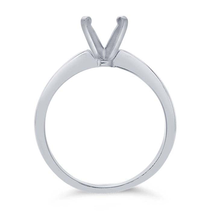 This 14-karat white gold engagement ring offers a 4-prong mounting that holds one 5.8mm (3/4 ct., approx.) round faceted gemstone. The band features an attractive tapered design. Cut a seat in the mounting to accommodate your stone, then burnish the prongs over the stone to secure it in place.