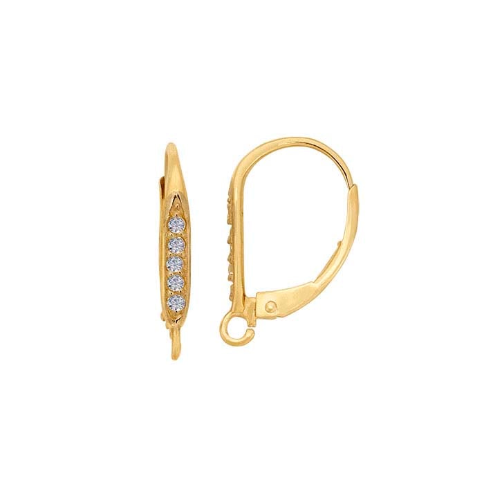 Ten 14-karatowy żółty złoty drucik do ucha z zapięciem dźwigniowym jest osadzony z pięcioma diamentami o masie 0,01 ct każdy (klasa I1-I2/kolor H,I; 0,1 CT całkowitej masy na parę) w wspólnych oprawach z czterema łapkami, osadzonych w dekoracyjnym kanale. Kolczyk posiada otwarty pierścień do mocowania zawieszek lub wiszących elementów. Zawiasowe zapięcie pomaga zapobiegać zgubieniu. Krótki, łukowaty odcinek drutu przechodzi przez ucho; koniec dźwigni jest zaprojektowany z krótkim odcinkiem otwartego kanału idealnie dopasowanego do drutu. Wystarczy włożyć drut i zamknąć dźwignię, aby zabezpieczyć kolczyk na miejscu.
