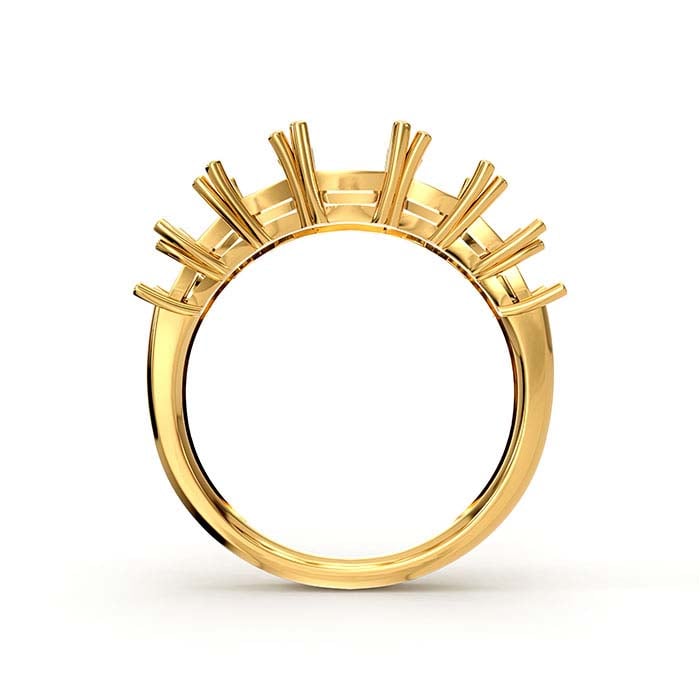Ta oprawa pierścionka z żółtego złota 18-karatowego posiada siedem 4-łapkowych opraw z wspólnymi łapkami, które utrzymują kamienie szlifowane szmaragdowo: jeden 8 x 5 mm, dwa 7 x 4 mm, dwa 6 x 3,5 mm oraz dwa 4,5 x 3 mm. Wytnij miejsce w łapkach, aby dopasować kamienie, a następnie wygładź łapki nad kamieniami, aby je zabezpieczyć.