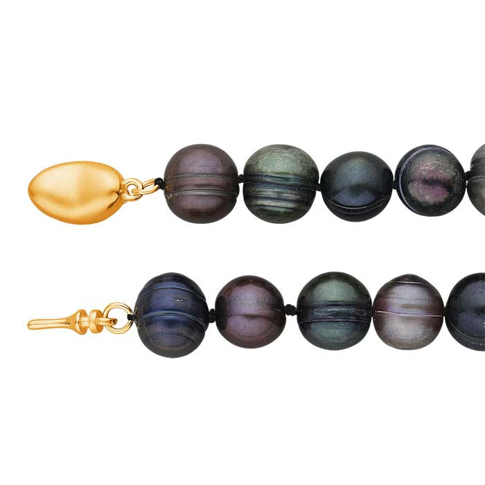 Ten gotowy naszyjnik z pereł zawiera hodowlane, okrągłe perły o średnicy 8–9 mm w różnych kolorach. Zakończony jest zapięciem typu push release ze srebra próby 925, pokrytym 14-karatowym żółtym złotem.
