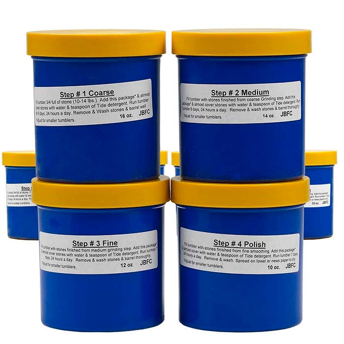 Polishing multiple stones at the same time? You'll get excellent results on a wide variety of stones, from soft to hard, with this four-stage set of tumbler charges and a tumbler load of up to 14 lbs. Taken step by step, the four charges in this kit perform the rough-cut through the final polish on many stones at once. Mass finishing is intended to handle a lot of stones at the same time and takes about 8 days per step using this kit. The multitude of stones serves as it own media, enhancing the finishing process (without needing any added media), along with the appropriate charge from this kit, some water and a bit of detergent. Complete instructions are included right on each jar. The four steps include: Step 1: Coarse, 16-oz. jar (60/80 grit) Step 2: Medium, 14-oz. jar (120/220 grit) Step 3: Fine Pre-polish, 12-oz. jar (400-grit) Step 4: Final polish, 10-oz. jar
