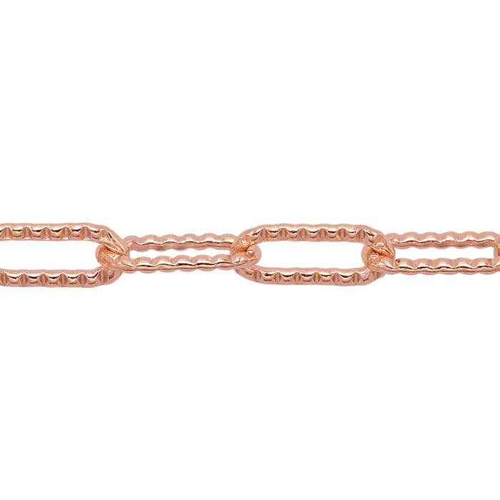 The patterned links on this 14/20 rose gold-filled chain add texture and variety to this versatile chain style. Offer the chain as is, or use it as a foundation for your custom designs. This chain is plated with 14-karat rose gold to ensure a uniform color. The most common chain style, cable chains are formed by simply connecting single links perpendicularly end to end. Links may be round, oval or other shapes. This chain is sold by the foot, so it's easy to be sure you have as much chain as you need.