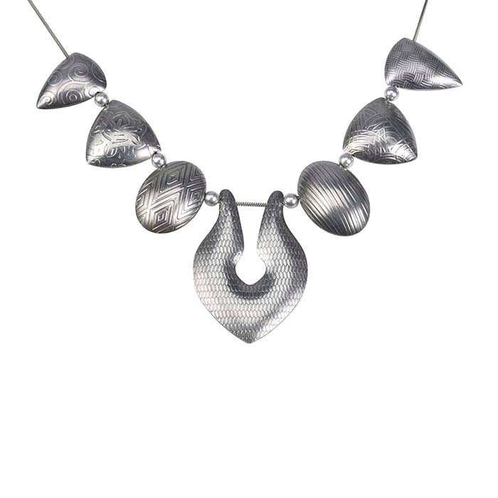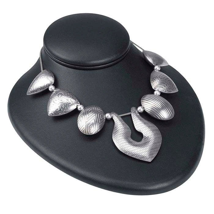 Form a variety of component shapes for your designs—consistently and accurately—with steel silhouette die plates. This plate features graduated shapes—great for creating graduated beads or necklace and bracelet forms. Use with a urethane container to focus all the force into the die plate for accurate volume shapes. Use a 60d urethane for more volume form and less detail; use a 95d urethane for more detail and less volume form. A kit including a urethane container with a stainless steel thumbscrew, a steel pusher, combination pattern die plates #1 and #3 and three urethanes (60, 80, 95d) is also available. Silhouette dimensions (L-R):