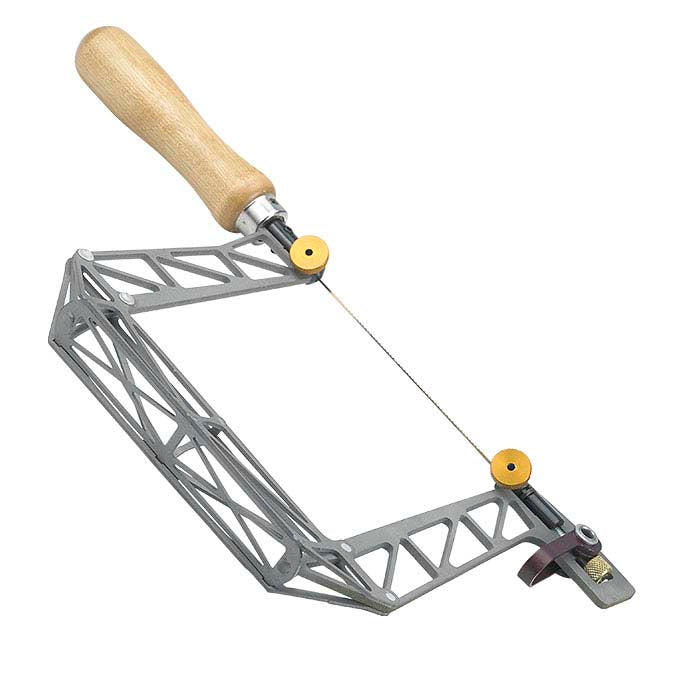 This titanium saw frame from Knew Concepts weighs only 6.75 ozs. (19 grams), far less than a comparable steel saw frame. The 5" (127mm) throat depth is ideal for fine work on small pieces; working length of the saw blade is 4-1/4". A comfortably curved wood handle and excellent balance and control make this saw an excellent choice.Made with a 'birdcage' scaffolding, this saw is extremely lightweight, yet very rigid with almost no flex as you saw. The result is improved control for every sawing task—and tighter turns than ever before possible. Enjoy the superior engineering of the original Knew Concepts jeweler's hand saw frame with two great improvements!First, a quick-change cam-lever tensioning system lets you quickly change blades. Next, a swivel allows you to swing the rear of the frame out of your way with a simple twist.With the cam-lever system, you can change blades quickly without losing your tension adjustment: simply flip the lever up to release tension, swap out blades and flip the lever back down. Save time and trouble when work demands repetitive blade changes, as when piercing metal. The swivel gives you the ability to set the frame into a "neutral corner" and frees you to saw into areas like never before. The frame swivels 45° to the left or right of center, and can be locked at left, right or center, also without disturbing the blade tension.Knew Concepts titanium saw frames are light and very rigid, providing exacting control, reduced blade breakage and virtually no flex.