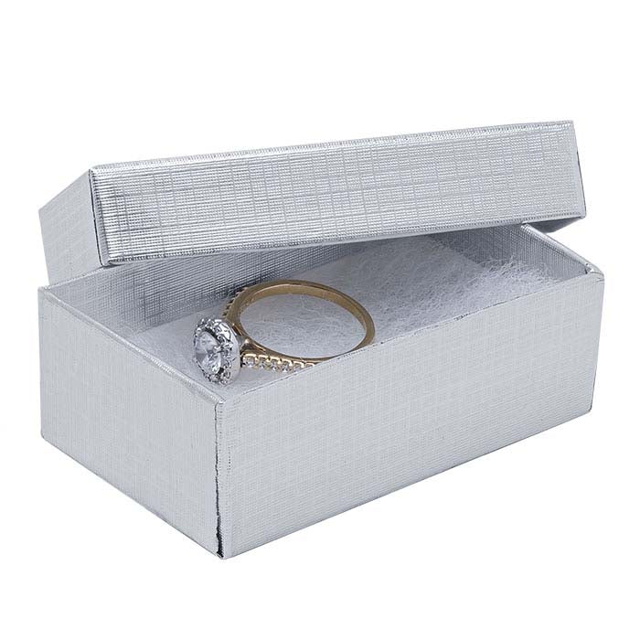 This two-part paper-covered ring box features an offset lid and accommodates all ring styles, even wide-shank or large cocktail-style rings. Add a decorative ribbon, gift wrapping or bow (available separately) to customize the box. Silver linen-finish foil covers the 100% recycled cardboard box (made with 90% post-consumer fiber and 10% pre-consumer fiber); includes a white die-cut flocked foam insert.