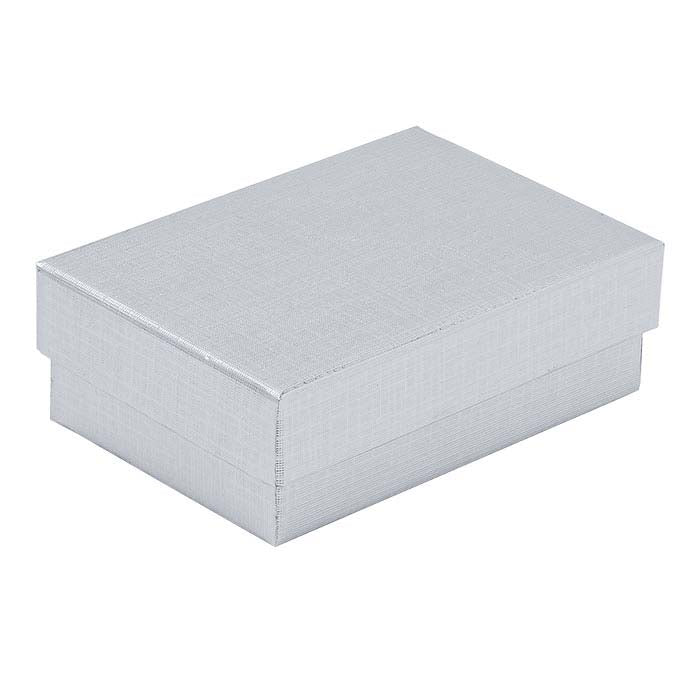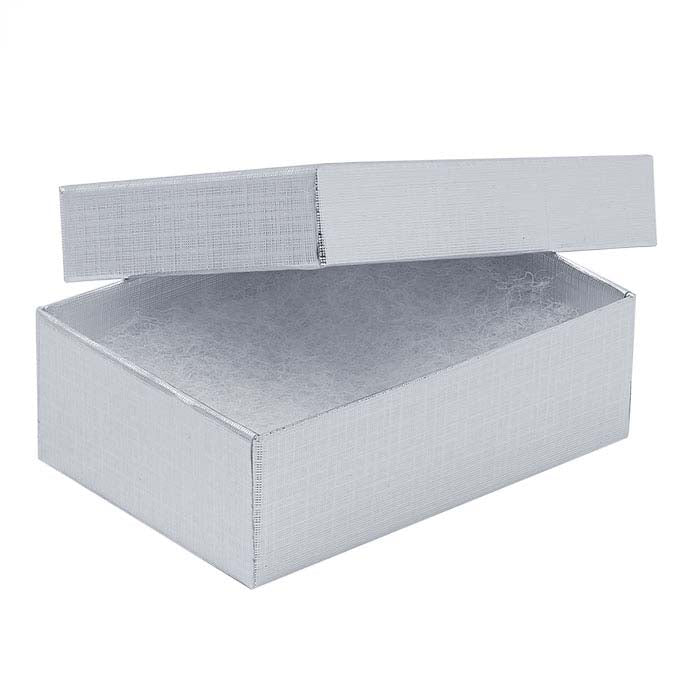 This paper-covered, two-part universal box accommodates a variety of jewelry styles. Use the box as-is, or mix & match it with solid-color cardboard boxes to create color combinations to suit your brand, for seasonal packaging, or for special occasions. Add a decorative ribbon, gift wrapping, or bow (available separately) to customize each box. Silver, linen-finish foil covers the 100% recycled cardboard box (made with 90% post-consumer fiber and 10% pre-consumer fiber); the box includes a 1/2"-thick white poly-fill wadding that will not cause tarnish.