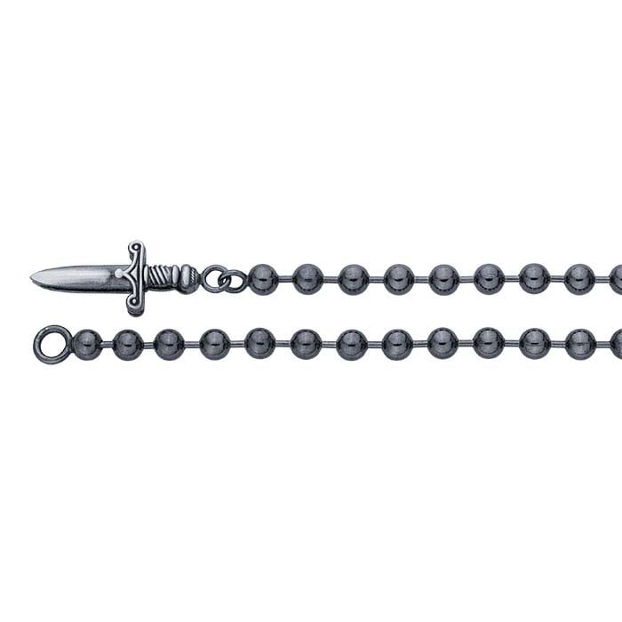 A black, ruthenium plating gives this sterling silver bead chain a dramatic look. Offer it as-is, or pair it with pendants, charms or drops for a one-of-a-kind look. This chain is finished with a unique knife clasp.Bead chain is characterized by spherical links, often hollow, that are joined by narrow connector wire or bars.