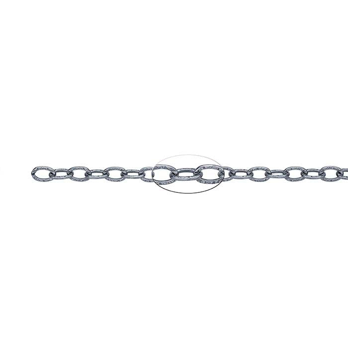 Featuring patterned oval links, this sterling silver cable chain is oxidized for a deep gray finish and is an ideal choice for a variety of designs. It offers a sleek look when worn as-is, but can be dressed up with an assortment of charms and drops for a custom look. The most common chain style, cable chains are formed by simply connecting single links perpendicularly end to end. Links may be round, oval or other shapes.