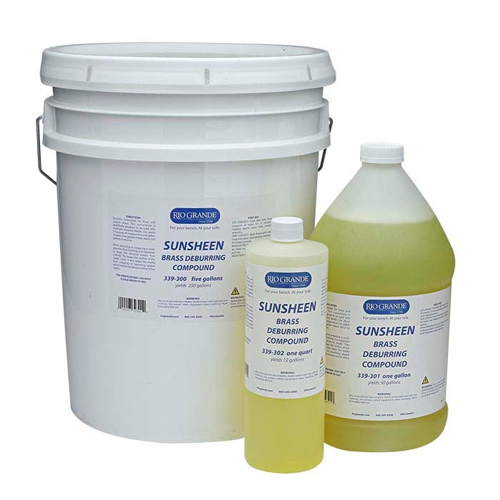 Sunsheen™ deburring compounds are formulated to work with all abrasive media and to suspend the sludge materials generated by a mass finishing cycle. • Formulated for brass and copper, this pH-balanced formula provides great results with abrasive media. • Use 1–3 oz. to make one gallon of solution (this 1-quart size makes up to 32 gallons of solution). • Compatible media: plastic, ceramic.