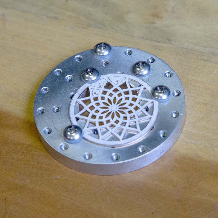 This small aluminum circle SawPlate clamp (NR5005) from Swanstrom Tools has an open center and 33 holes that allow you to securely hold a variety of flat stampings and metal pieces. The clamp is ideal for use with the SawPlate (available separately) and works well on its own to help reduce stress on your hands and fingers when working with small items. A Delrin® washer under each screw prevents marring the surface of your piece. Includes one hex key and eight steel screws.Manufactured in the USA.