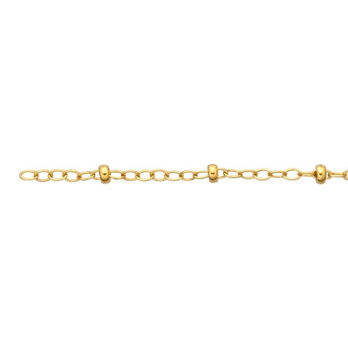 This delicate 14/20 yellow gold-filled oval cable chain features 2mm 14-karat yellow gold roundel beads evenly spaced along its length in a tin-cup style. Offer it as-is, or add a pendant to complete the look. The chain and beads are plated with 14-karat yellow gold to ensure a uniform color.The most common chain style, cable chains are formed by simply connecting single links perpendicularly end to end. Links may be round, oval or other shapes.This chain is sold by the foot, allowing you to have exactly the length you need when you need it.