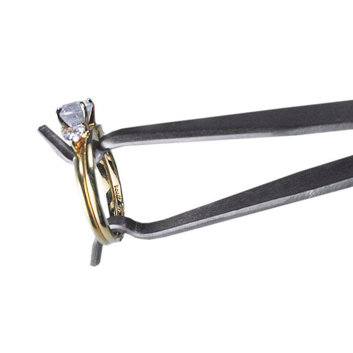 These ring-soldering tweezers are specially designed to position rings accurately for clean, quick soldering. Squeeze the tweezers closed, insert them into the band of the ring, and release; the curved tips hook into the band of the ring, and tweezers will hold the ring in place through natural tension. These tweezers are also perfect for soldering wedding ring sets together.