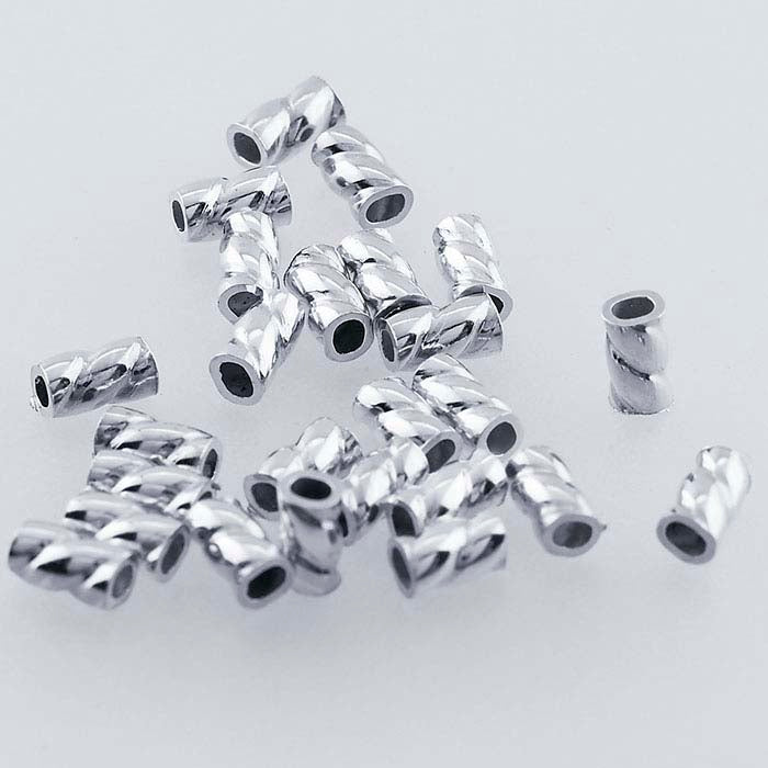 Esta conta de cravar em prata esterlina é feita de tubo torcido e tem aberturas ovais. É durável e proporciona um acabamento seguro em designs enfiados feitos com tigertail, foxtail, Beadalon® ou qualquer outro material de fio para enfiar. As contas de cravar são contas curtas, de parede fina e estilo tubo, ideais para fixar fio e cordão sem ter de fazer nós. O fio passa pela conta, depois pelo fecho ou outro achado, e volta a passar pela conta. Para fixar a conta, crave-a firmemente no fio usando alicates especialmente desenhados que achatam e dobram a conta de forma limpa sem a esmagar. Escolha uma conta de cravar com um diâmetro interior que acomode pelo menos duas espessuras do cordão/fio que vai usar, e mais se for trabalhar com fios duplos ou triplos.
