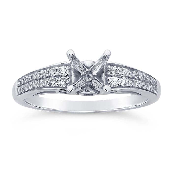 This 14-karat white gold ring features a 4-prong mounting that holds one 4.5mm (1/2-ct.) princess-cut faceted gemstone. The tapered shank is set with 38 round diamonds: four 0.015-ct., two 0.0125-ct., four 0.01-ct., four 0.008-ct., four 0.006-ct. and twenty 0.005-ct. Cut a seat in the prongs to accommodate your stone, then burnish the prongs over the stone to secure it in place.A classic choice, the 4-prong mounting supports the gemstone on four sides.