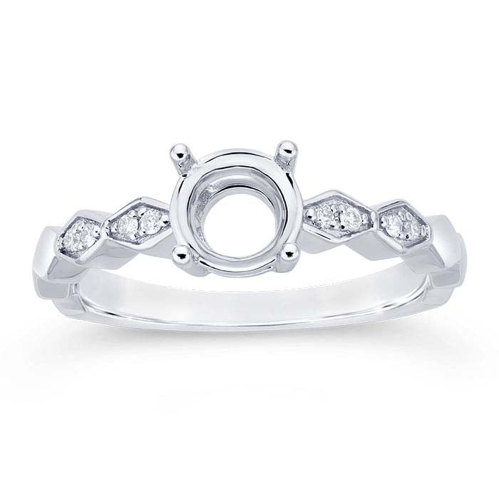 This 14-karat white gold ring features a 4-prong mounting that holds one 6.5mm (1-ct., approx.) round faceted gemstone. The shank is set with eight 0.0067-ct. round diamonds (SI clarity/G, H color; 0.0536CTTW), four on each side of the mounting. Cut a seat in the prongs to accommodate your stone, then burnish the prongs over the stone to secure it in place.A classic choice, the 4-prong mounting supports the gemstone on four sides.