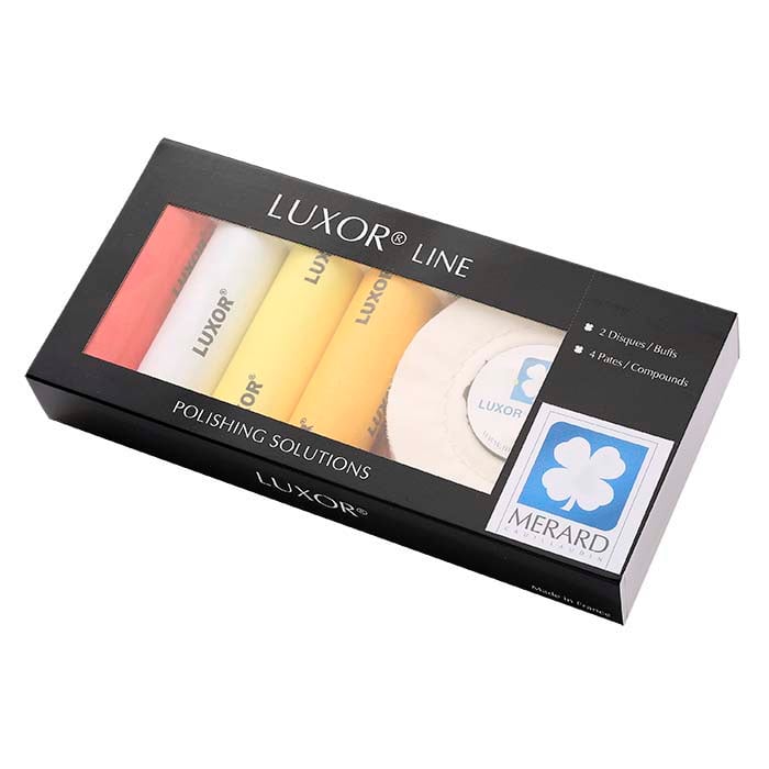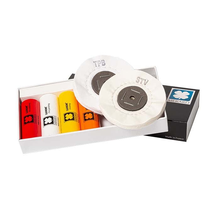 Remove work marks, refine surfaces and create a mirror-like finish on your workpieces with this polishing kit from Merard. The kit includes four Luxor® by Merard polishing compounds (120g each)—compounds that put more than twice the abrasive to work on finishing your jewelry designs, are easily cleaned from workpieces and are silica-free—and two cotton buffs designed to work with high efficiency and to deliver a longer service life.Compounds:• Luxor® pink—a 6.5-micron compound that removes dents and scratches from gold, platinum and silver surfaces.• Luxor® white—a 0.3-micron compound with smaller yet more aggressive abrasive that creates a smooth finish on surfaces.• Luxor® yellow—a 0.5-micron compound that produces a mirror-like finish on gold, brass and copper alloys.• Luxor® orange—a 0.1-micron compound that delivers a mirror-like finish on precious metals, stainless steel, titanium, and brass and copper alloys.Buffs:• Merard MB-style—a cotton buff that offers a rigid, high-resistance texture and is ideal for use with Luxor® pink polishing compound.• Merard STV-style—a cotton buff with a rigid, high-resistance texture and some give that is an ideal partner for Luxor® white, yellow, and orange polishing compounds.Luxor® by Merard polishing compounds are designed for jewelers and watchmakers. They are manufactured from the highest-quality aluminum oxide abrasive and animal fats—a combination that delivers consistent results and dependable performance. With 70% aluminum oxide abrasive and strict product specifications, the compounds are highly effective using small amounts. Luxor polishing compounds are color-coded for easy identification.Merard cotton buffs, specially designed for jewelers and watchmakers, are made with cotton fabric that is manufactured onsite in France using bolts of cloth sourced to ensure the highest-quality cotton fiber. The buffs are assembled with an exclusive process and are treated for increased longevity. Merard cotton buffs deliver an impressive service life, producing consistent results and dependable performance throughout.