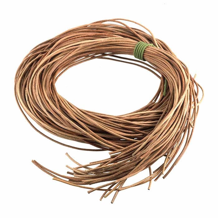 This high-quality natural Greek leather round cord is a soft and flexible cord ideal for all kinds of jewelry designs, including knotted necklaces, strung beads, and braided and wrapped designs. The tight-grained leather delivers a high degree of flexibility, strength and durability, with a consistent, spot-free color. The natural tan of the leather provides a simple foundation for contemporary jewelry designs; use this cord alone or with other colors for wrapped, knotted or braided pieces. A tough, natural material, leather is ideal for a variety of strung or fabricated jewelry and accessory designs.This package contains 50 pre-cut strands, each approximately 90cm (34") long.