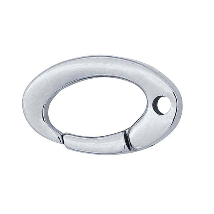 This push clasp, made from 304-grade stainless steel, features a sleek oval shape, a tie-off hole (0.064"), and a spring-loaded hinge opening for easy use; pair it with a plain or decorative ring (larger than 3.1mm ID). Push clasps are clasps designed to simply push onto a ring, engaging a spring mechanism that holds the clasp closed until it is pushed to open, allowing the parts to separate.