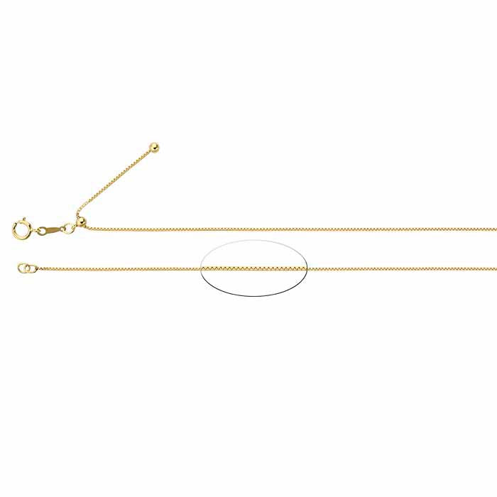 This 14/20 yellow gold-filled box chain offers a classic look and is perfect for small pendants, drops and charms. The clasp features a silicone-lined bead that stays in place on the chain but allows customers to slide the chain through the bead to adjust the chain up to a maximum length of 22".Box chain has squared-off links that resemble cubes; they are sturdy chains, ideal for pendants. This chain is plated with 14-karat yellow gold to ensure a uniform color.