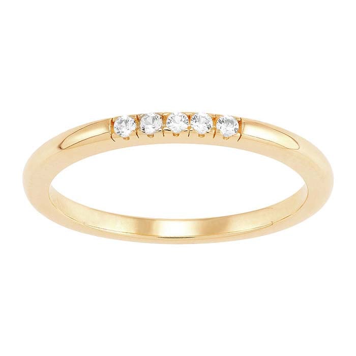 Denna 14-karats guldförgyllda sterlingsilverring är infattad med fem 1,5 mm runda, slipade, laboratorieodlade vita safirstenar. Den ser fantastisk ut som ett fristående smycke eller staplad tillsammans med andra ringar. Ringen har en ".925" sterlingsilverstämpel som en symbol för garanterad produktkvalitet.