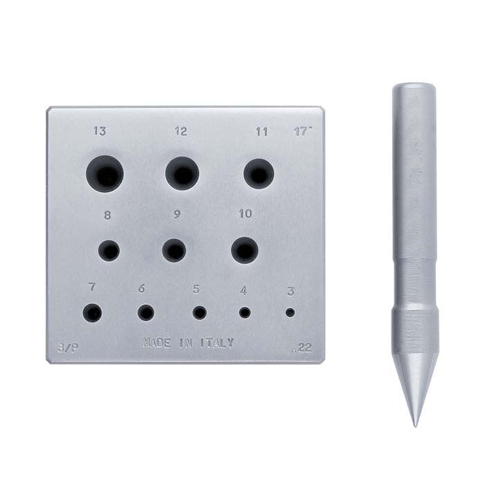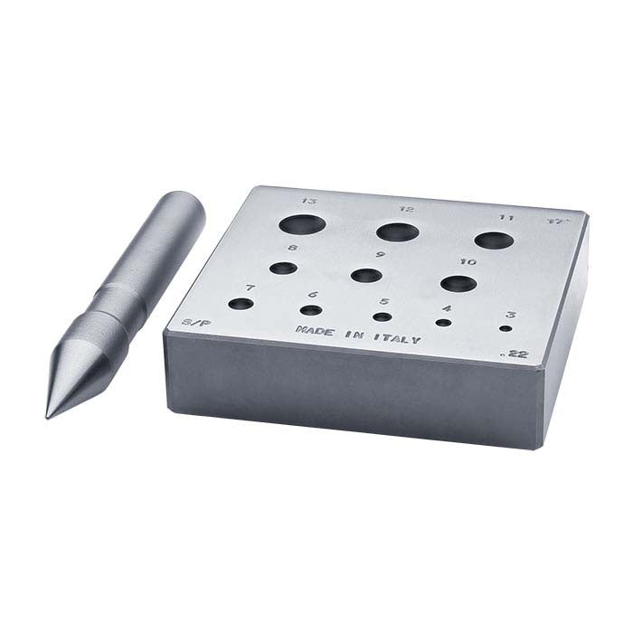 This steel forming block allows you to easily create perfect round bezels and prong settings. Each of the 11 holes has a 17° angle that is precisely machined to match the included and punch. A finely polished surface helps prevent marring metal surfaces. The block and punch are made from steel that is hardened to 62 HRC that ensures a long life.