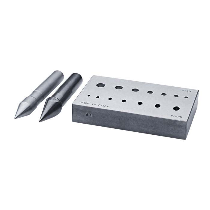 This steel forming block allows you to easily create perfect bezels and prong settings. Each of the 14 holes has a 17° angle that is precisely machined to match the included oval and round punches. A finely polished surface helps prevent marring metal surfaces. The block and punches are made from steel that is hardened to 62 HRC that ensures a long life.