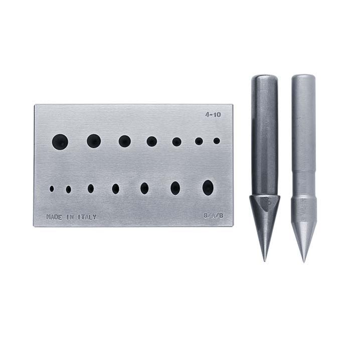Denna stålformningsblock gör att du enkelt kan skapa perfekta infattningar och klofattningar. Var och en av de 14 hålen har en 17° vinkel som är precis bearbetad för att matcha de medföljande ovala och runda stansarna. En fint polerad yta hjälper till att förhindra repor på metallytor. Blocket och stansarna är tillverkade av stål som är härdat till 62 HRC vilket säkerställer lång livslängd.