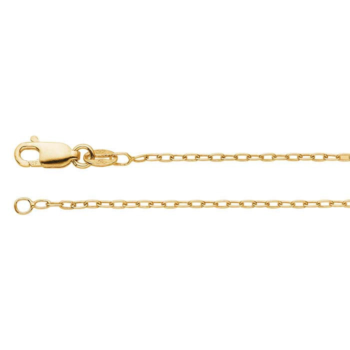 This 14/20 yellow gold-filled oval cable chain is the perfect backdrop for delicate designs. Offer it as-is, or add small charms, drops or dangles for a custom look. The most common chain style, cable chains are formed by simply connecting single links perpendicularly end to end. Links may be round, oval or other shapes—the links of this chain are oval.
