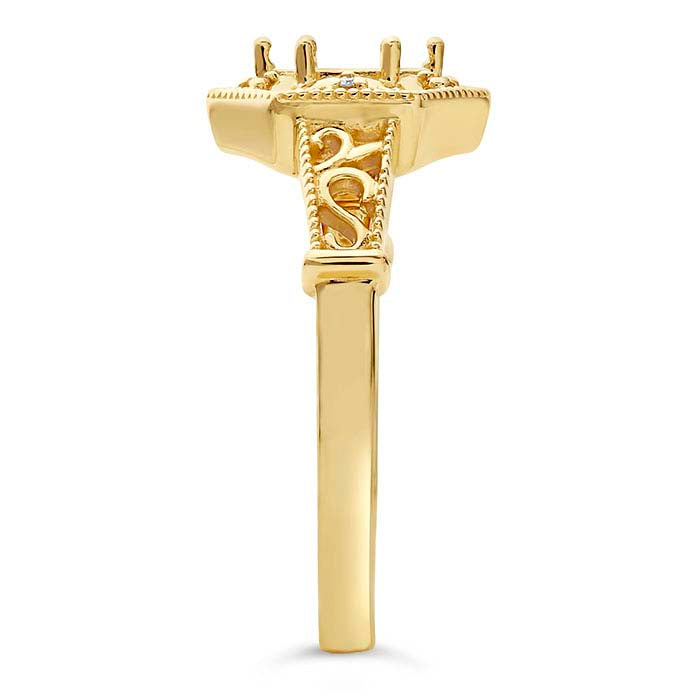 This 14-karat yellow gold ring features a 6-prong, pre-notched hexagon mounting with six 0.08mm round diamonds—one on each side—for added visual interest. The mounting holds one 5mm hexagon faceted gemstone and features fine milgrain detailing, while the upper part of the shank features delicate scrollwork for an elegant look. The entire ring features a bright, eye-catching finish.
