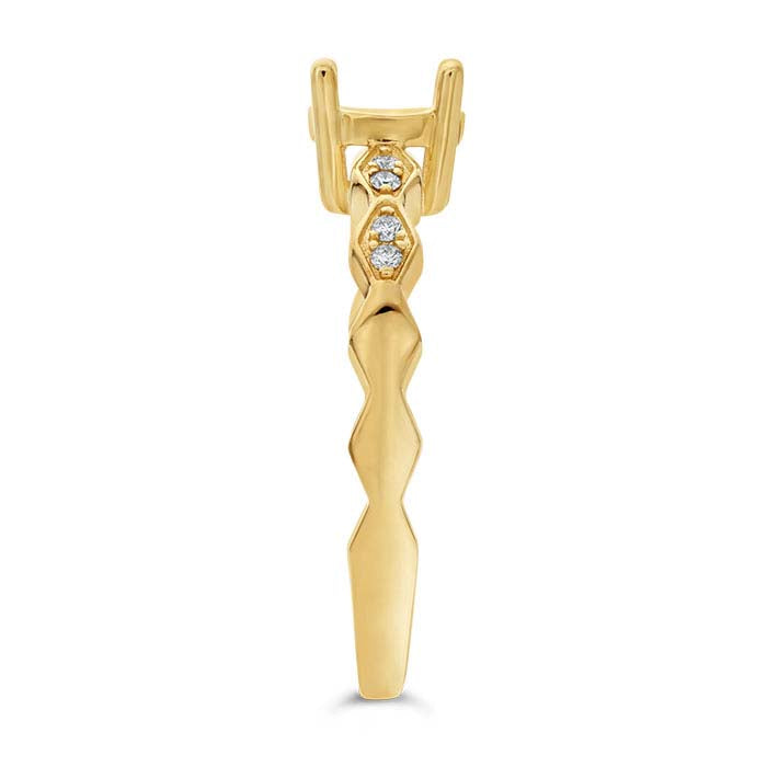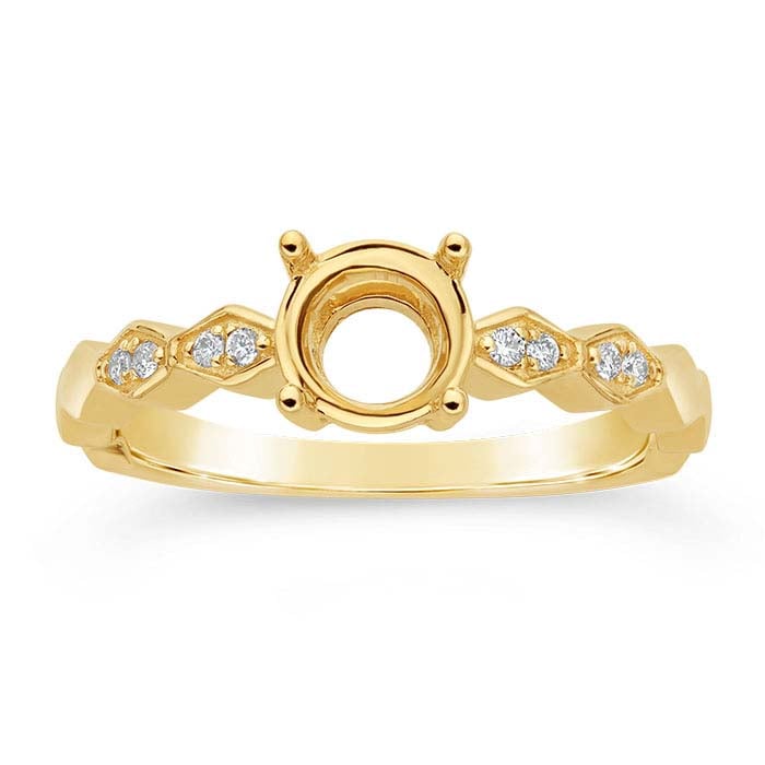 This 14-karat yellow gold ring features a 4-prong mounting that holds one 6.5mm (1-ct., approx.) round faceted gemstone. The shank is set with eight 0.0067-ct. round diamonds (SI clarity/G, H color; 0.0536CTTW), four on each side of the mounting. Cut a seat in the prongs to accommodate your stone, then burnish the prongs over the stone to secure it in place.A classic choice, the 4-prong mounting supports the gemstone on four sides.