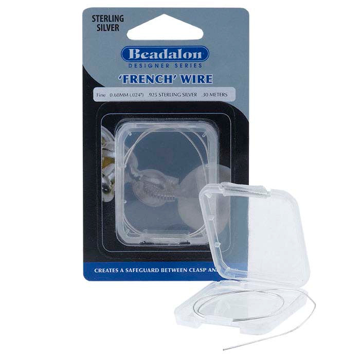 This sterling silver French wire protects the bead cord from damage and extends the life of the jewelry, while the silver is a good color match for silver and other white-metal clasps, creating a seamless look in strung jewelry. French wire (bullion) reinforces bead cord where it passes through clasp components. Clip off a short length of the coiled wire and pass your stringing material through the coil then through your clasp component, and finally back through your strand to finish. The coil will shape itself to the ring on the clasp, protecting the cord against friction and wear. Each package contains 1 ft. of sterling silver French wire.