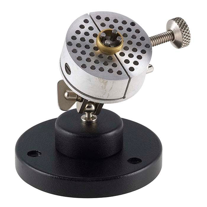 将定位销插入此夹持器可调金属夹爪的孔中,以固定小型、扁平或形状不规则的零件,便于雕刻、雕刻、锉削、镶嵌宝石等操作。夹爪闭合时直径为2英寸,最大开启宽度为2-3/4英寸,可容纳各种工件。其加重底座配备了第三只手式球形支架,可根据工件需求调整至任意位置。三个预钻孔允许您将底座牢固安装在工作台或工作面上(不含安装硬件)。坚固的底座(直径3-1/2英寸)提供出色的免手持支撑。此工作夹持器包括六个定位销和一个黄铜环,用于运输过程中固定。